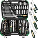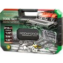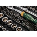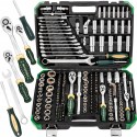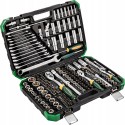 W skład zestawu wchodzi szeroki wybór narzędzi, w tym krótkie i długie nasadki w rozmiarach 1/4", 3/8" oraz 1/2", a także bity, przedłużki, przeguby Cardana oraz klucze płasko-oczkowe. Taka różnorodność sprawia, że zestaw jest doskonały do realizacji różnych projektów, od prostych napraw po bardziej skomplikowane zadania.