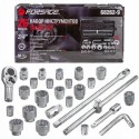 Ten profesjonalny zestaw narzędzi doskonale sprawdzi się w trudnych warunkach, takich jak naprawy w warsztatach samochodowych czy serwisowanie maszyn rolniczych. Dzięki różnorodności nasadek, zestaw jest idealny do odkręcania i dokręcania dużych śrub.