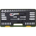 44 elementy: nasadki 6 – 24 mm, nasadki głębokie 10 – 17 mm (do śrub z długim wystającym gwintem). Nasadki do świec 14, 16, 18, 21 mm.