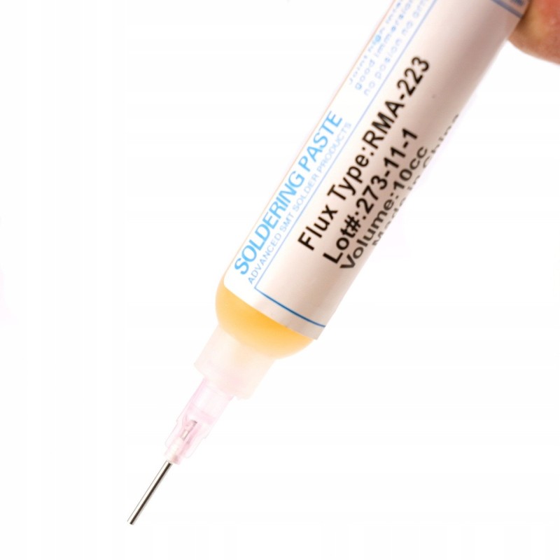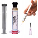 W zestawie znajduje się również topnik RMA-223, który wyróżnia się łatwością aplikacji dzięki żelowej konsystencji. Jest to flux NO CLEAN, co oznacza, że nie wymaga dodatkowego czyszczenia po użyciu. Idealnie nadaje się do napraw elementów elektronicznych, takich jak układy BGA, zapewniając trwałe połączenia.