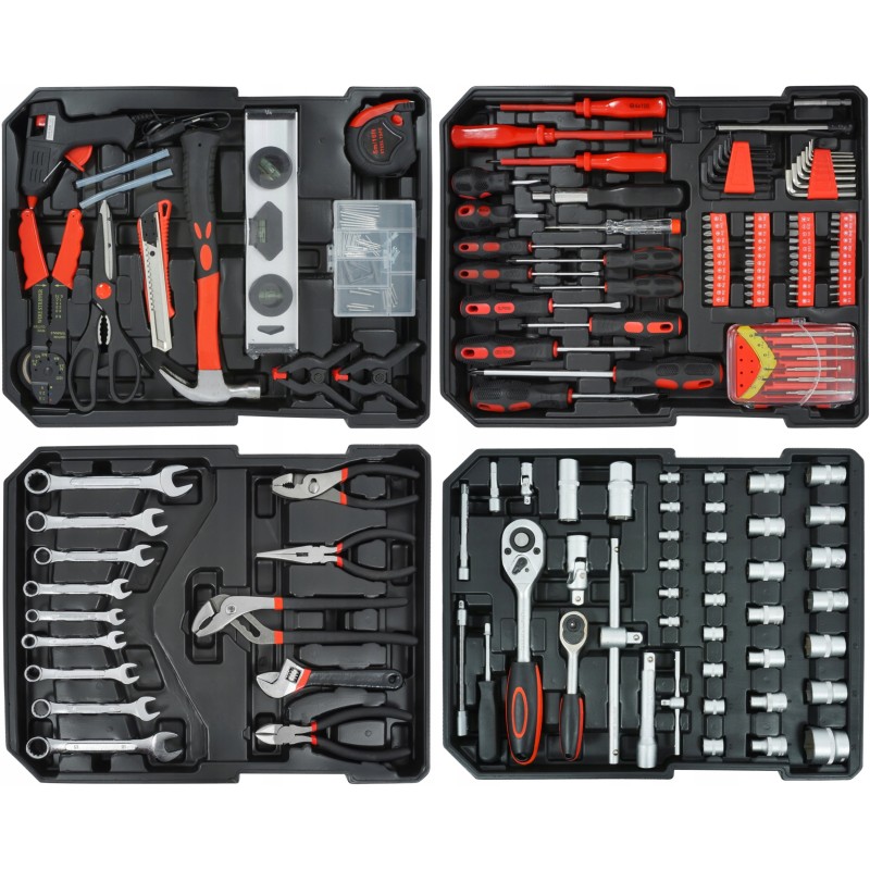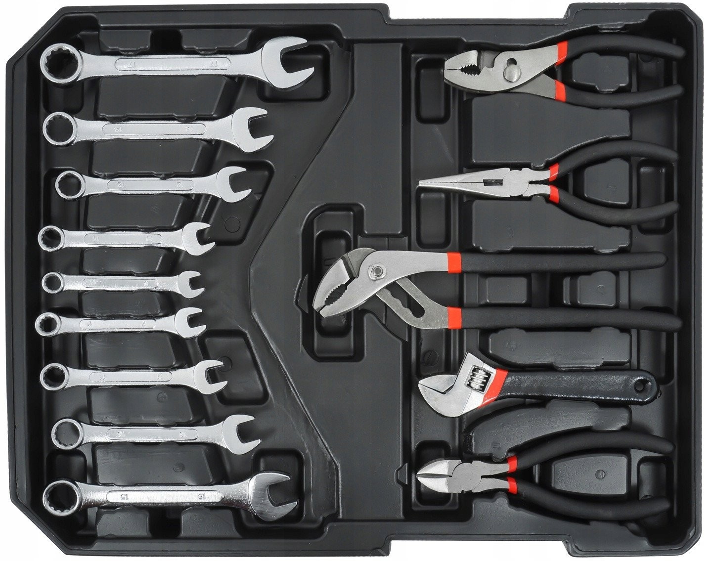 Ten uniwersalny zestaw narzędziowy jest idealny do różnorodnych prac w domu oraz warsztacie. Obejmuje nie tylko podstawowe narzędzia, ale także specjalistyczne akcesoria, które ułatwiają wykonywanie różnych zadań, co czyni go niezastąpionym narzędziem dla każdego majsterkowicza.