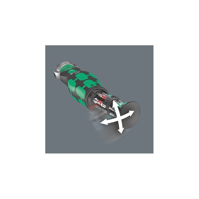 W rękojeści kompaktowej grzechotki Zyklop znajduje się zabezpieczony przed zgubieniem, swobodnie obracający się magazynek na 12 bitów (1/4", długość 25 mm).