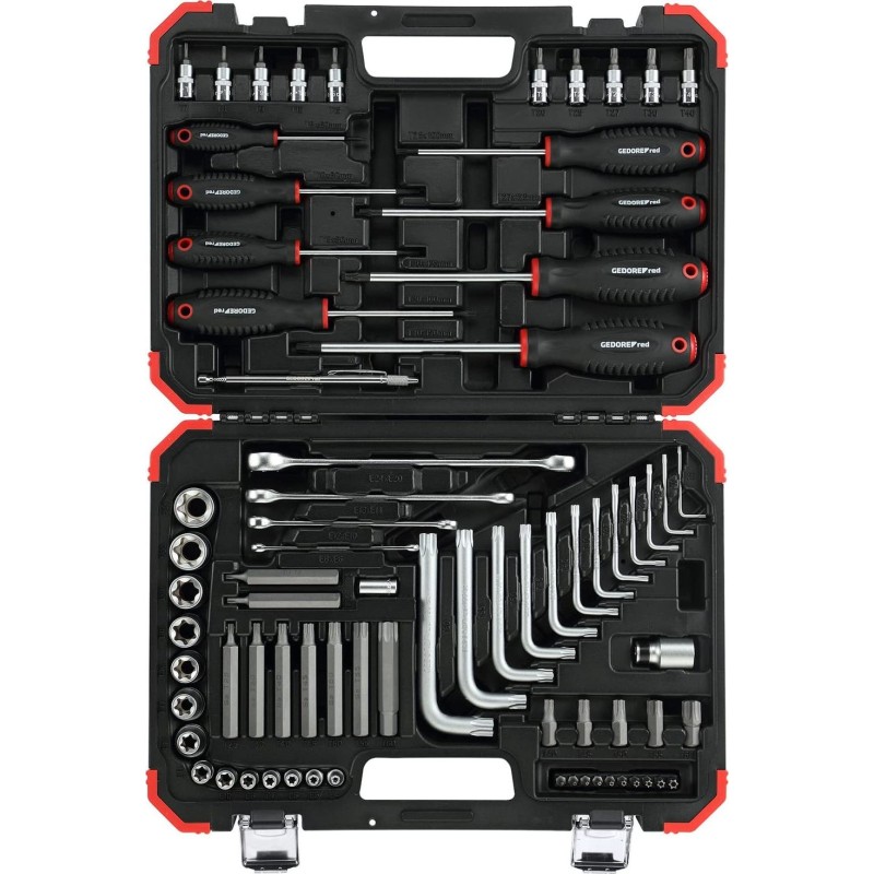 Opis: Zestaw narzędzi do śrubokrętów TORX R68003075 w kolorze czerwonym GEDORE zawiera 75 części, w tym śrubokręt, klucz oczkowy z podwójnym pierścieniem, śrubokręt z przesunięciem, bity klucza nasadowego i bity do wewnętrznych i zewnętrznych śrub TORX. Nadaje się do ręcznie obsługiwanych skrzynek wkręcających. Narzędzia wykonane są ze stali chromowo-wanadowej i mają matowe, chromowane wykończenie. Narzędzia są zabezpieczone w plastikowej skrzynce z metalowym zamkiem.