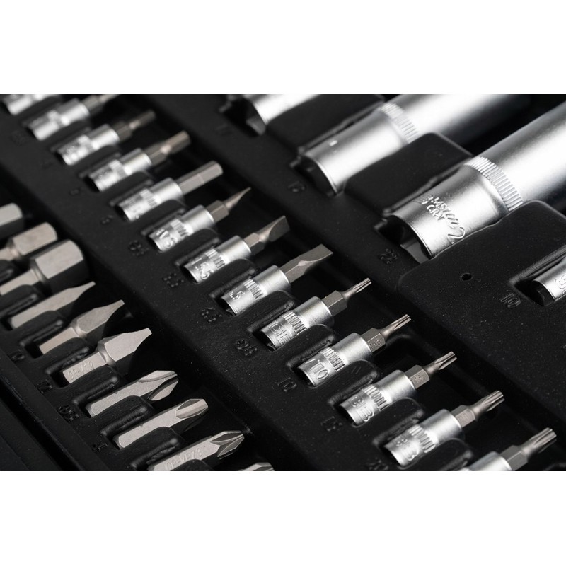 - 18x nasadka z bitami - HEX: H3, H4, H5, H6, Torx: T8, T10, T15, T20, T25, T27, T30, PZ: 1,2, PH: 1, 2, SL: 4, 5.5, 6.5,
