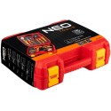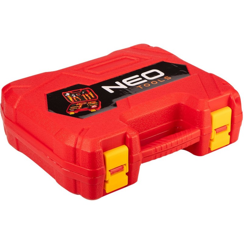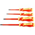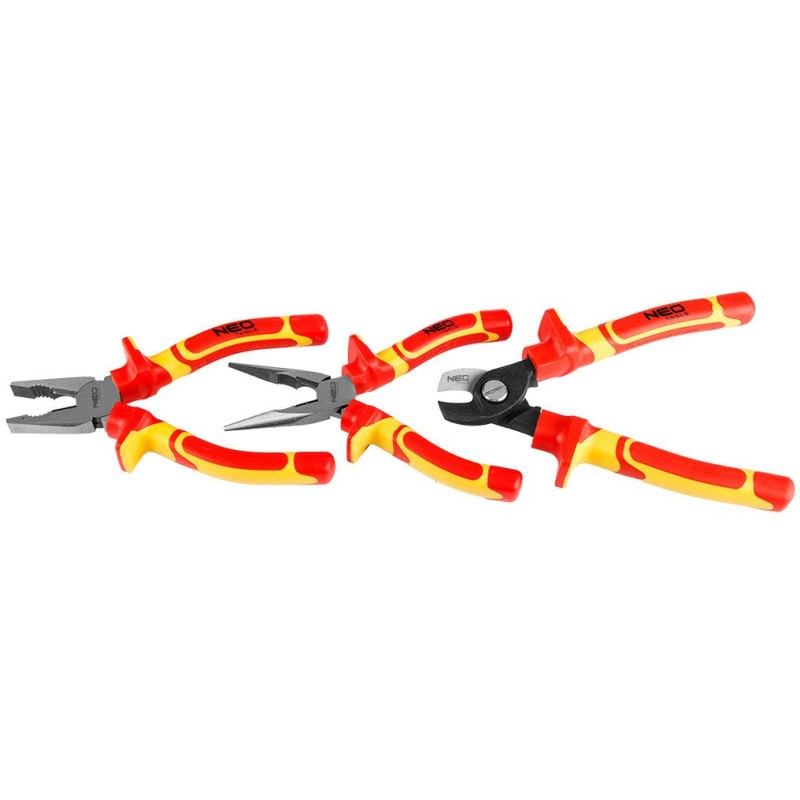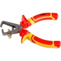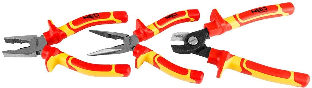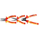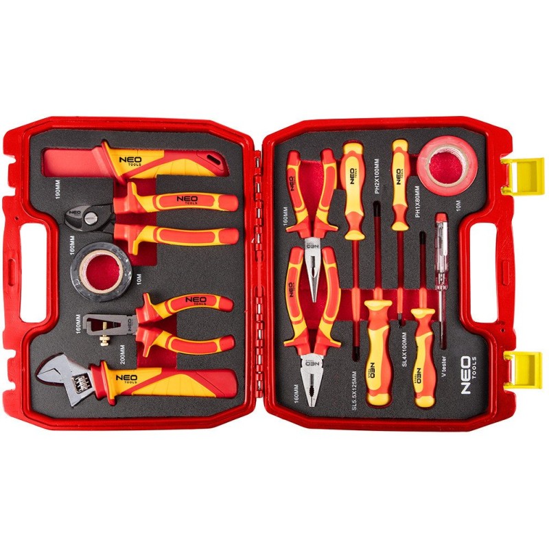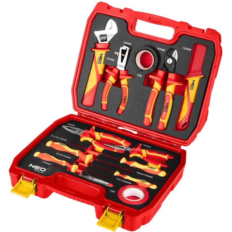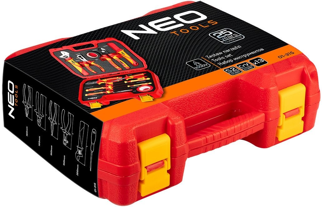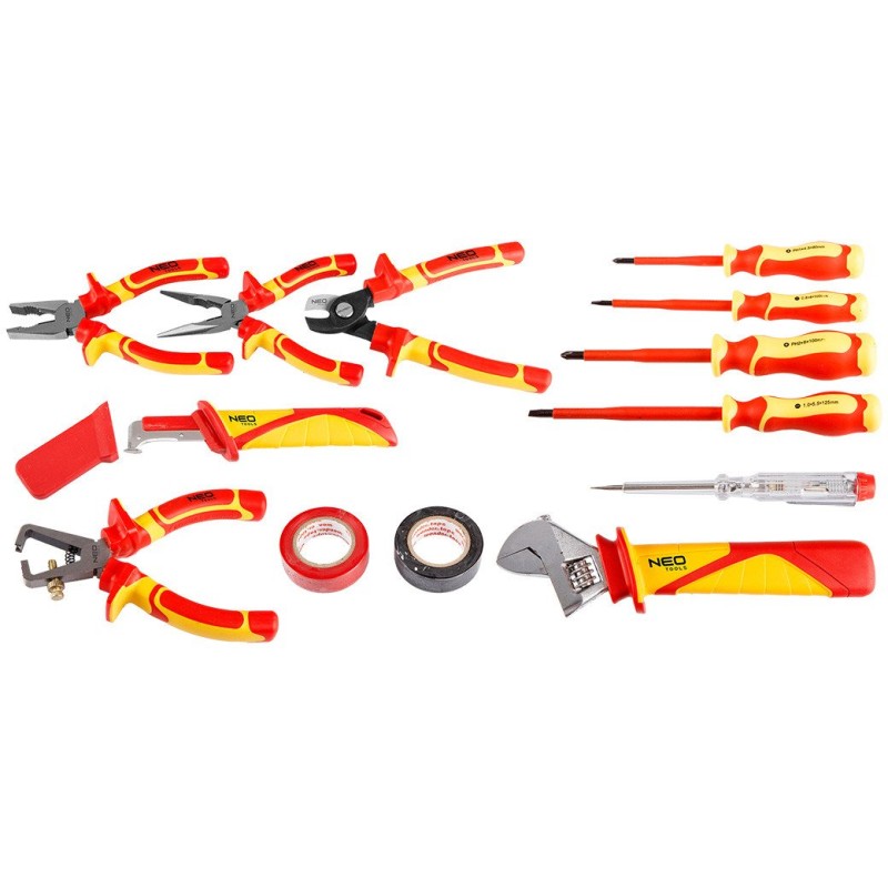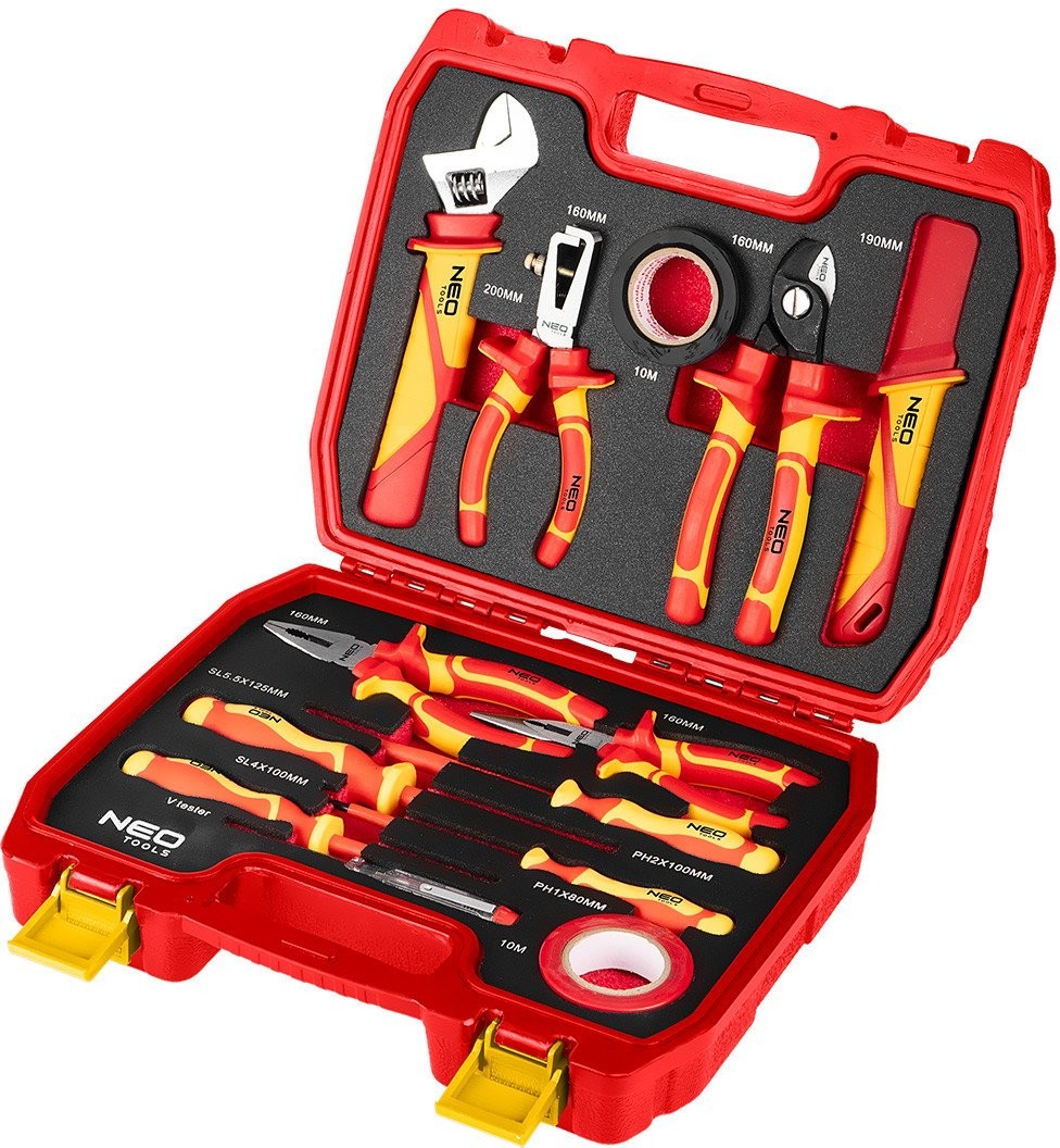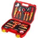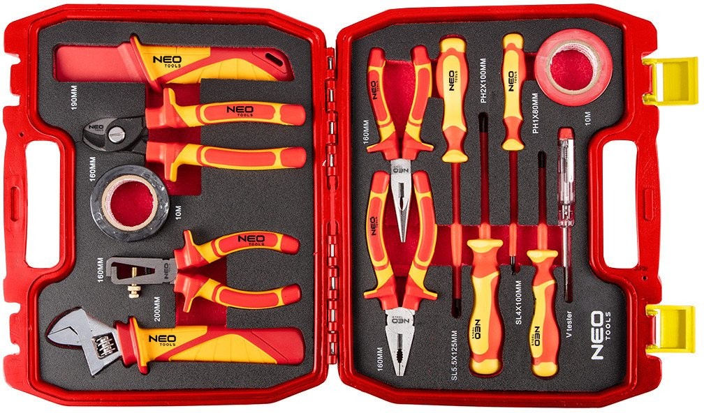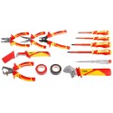Zestaw elektryka w walizce 13 el. rękojeść dwumateriałowa, szczypce stal CrV, wkrętaki stal S2, 4 sztuki szczypiec: szczypce uniwersalne 160mm, szczypce wydłużone proste 160mm, ściagacz izolacji 160mm, obcinak do kabli 160mm, 4 sztuki wkrętaków: płaski 0.8*4*100mm, płaski 1.0*5.5*125mm, krzyżowy PH1*80, krzyżowy PH2*100mm, 1 szt. izolowany klucz nastawny 200mm, 1 szt. izolowany nóż do izolacji, 1 szt. taśma izolacyjna czarna 10m, 1 szt. taśma izolacyjna czerwona 10m, 1 szt. próbnik napięcia 150mm