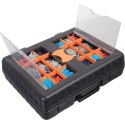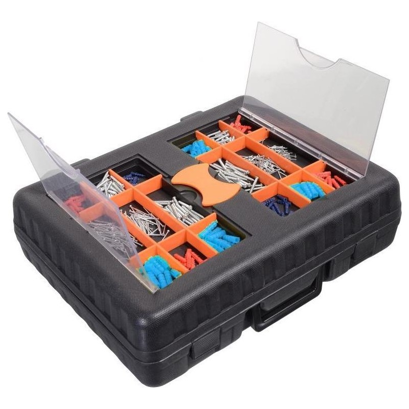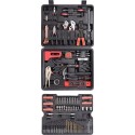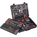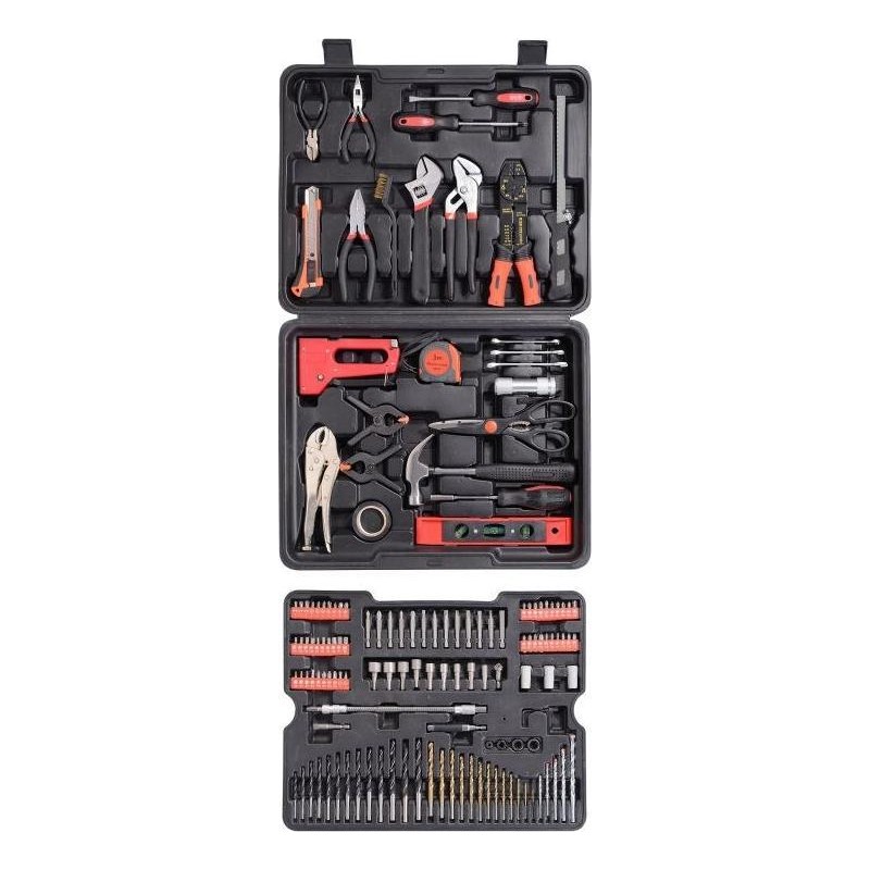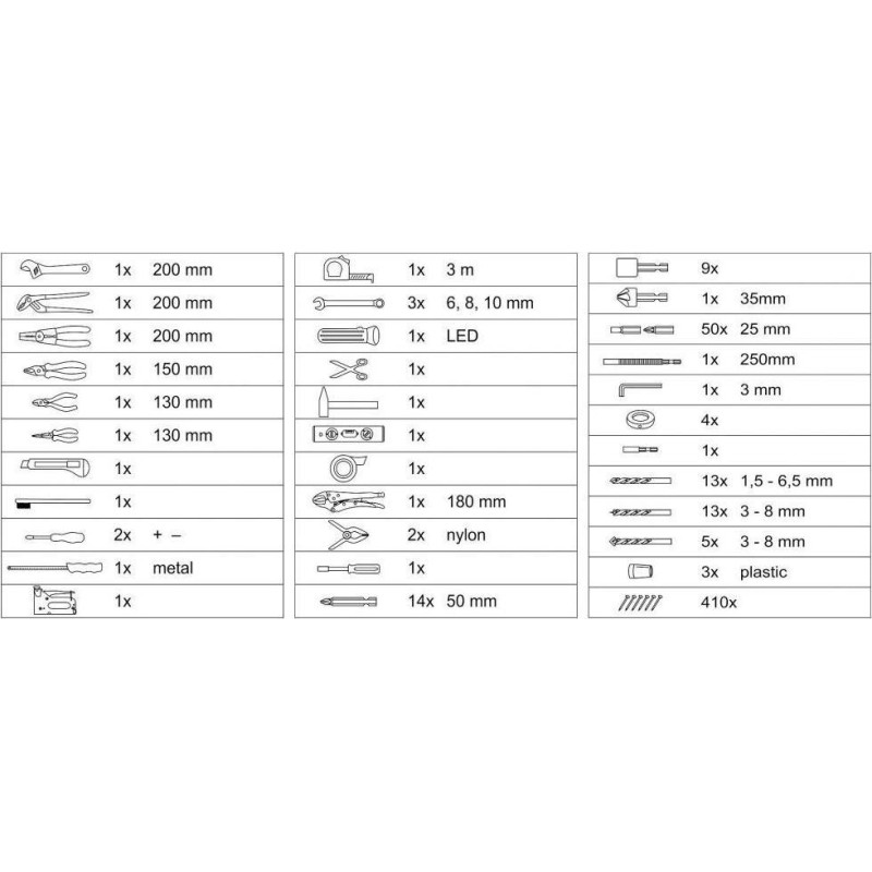 Wszystko jest ułożone w przejrzystych pozycjach, plus jedna taca z narzędziami w środku. Zestaw zawiera szeroką gamę wierteł, bitów, kluczy nasadowych, wkrętaków, szczypiec, młotka, poziomnicy, kluczy bocznych, podstawowych elementów złącznych i wielu innych narzędzi, które nadają się do użytku w domu, w garażu i na drodze.
