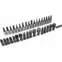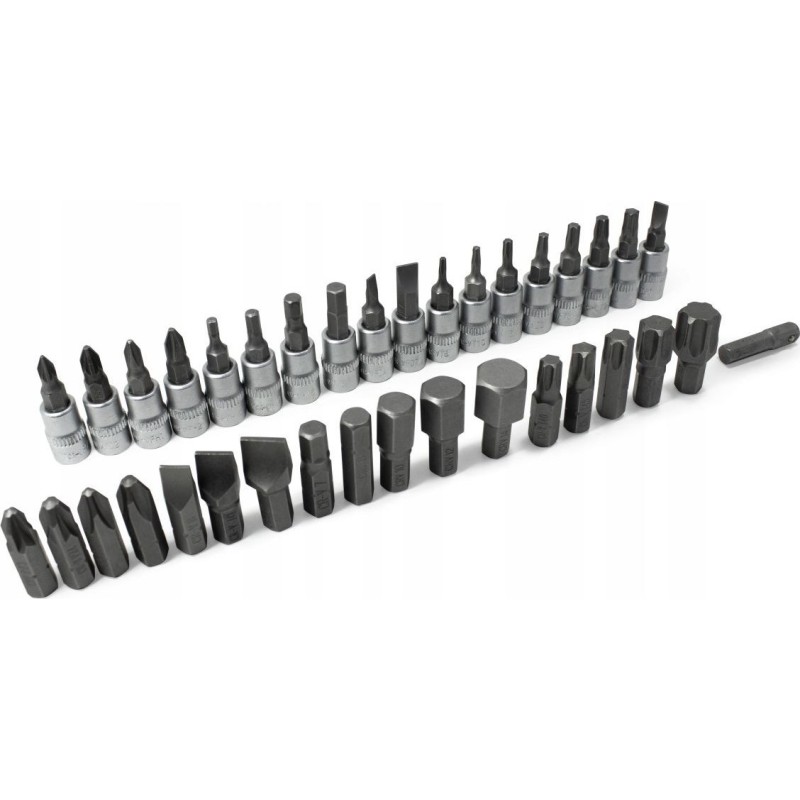 - Nasadki bity - 17 szt.: FD 8, 10, 12; T 40, 45, 50, 55, 60; PH 3, 4; PZ 3, 4; HEX 7, 8, 10, 12, 14