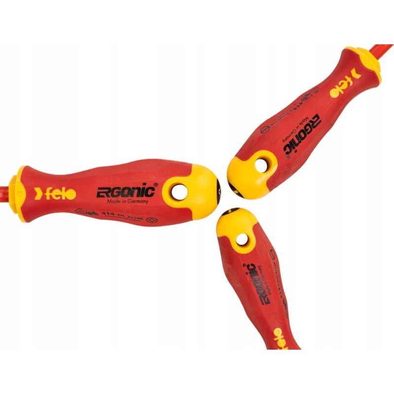 Wyposaż się w narzędzia, które spełniają Twoje wymagania. FELO to symbol profesjonalizmu i zaawansowanej technologii. Felo jako pierwsza firma na świecie przedstawiła rękojeść wkrętaka automatycznie dostosowującą się do dłoni użytkownika – ERGONIC. Praca z wkrętakiem ERGONIC, w połączeniu z najbardziej znanych i renomowanych marek, jest znacznie łatwiejsza, bardziej komfortowa – a co za tym idzie – szybsza. Dodatkowo rękojeści ERGONIC mają poprzeczny otwór mogący służyć jako zawieszka lub można go wykorzystać do zamocowania dźwigni ułatwiającej dokręcanie/odkręcanie śruby. Idealnie gładka, pozbawiona szwów końcówka uchwytu zapewnia maksymalny komfort pracy, natomiast asymetryczny kształt kołnierza rękojeści zapobiega niekontrolowanemu toczniu narzędzia – od teraz wkrętak zawsze pozostanie tam, gdzie go zostawisz i nie będzie się niekontrolowanie przesuwał w niepożądanym kierunku! Na pewno docenisz to podczas pracy! Bardzo ważne jest również to, że wkrętaki FELO są zdolne do przenoszenia wysokich momentów obrotowych, spełniając jednocześnie wysokie wymagania wszelkich norm technicznych. Doskonałe dopasowanie rękojeści wkrętaka do dłoni skutkuje mniejszym wysiłkiem przy pracy. Na końcu każdej rączki znajduje się wyraźny symbol końcówki wkrętaka, co znacznie ułatwia identyfikację narzędzia. Już nie musisz przeszukiwać wkrętaków metodą prób i błędów – to z pewnością zaoszczędzi Twój czas! Seria 400 VDE ERGONIC umozliwia pracę pod napięciem w instalacjach elektrycznych (izolowane do pracy pod napięciem do 1000 V).
