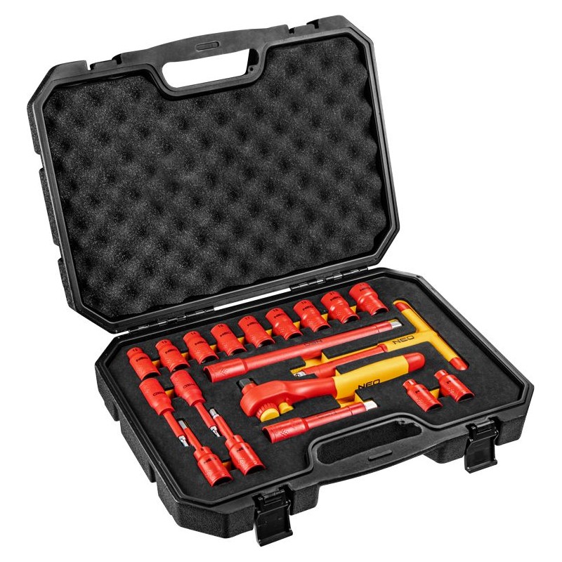 Zestaw kluczy nasadowych 1/2" NEO (nr ref. 01-306) składa się z 19 elementów, wykonanych z wysokiej jakości stali chromowo-wanadowej. W skład zestawu wchodzi odgięta grzechotka, wyposażona w trwały mechanizm zapadkowy (36 zęby) i ergonomiczny uchwyt. Zestaw zawiera bogaty pakiet nasadek sześciokątnych (w rozmiarach od 10 do 21 mm). Uzupełnieniem zestawu są przedłużki, przegub, pokrętło i klucze sześciokątne na nasadkach (w rozmiarach4 do 8 mm). Całość jest dostarczona w praktycznej i solidnej walizce wykonanej z tworzywa.