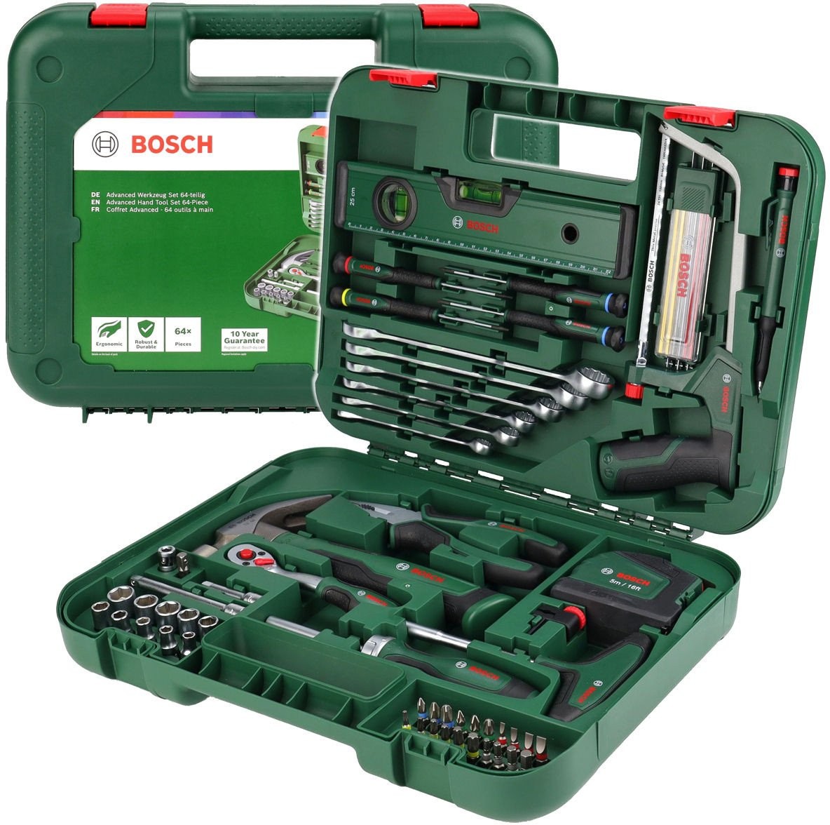 Zestaw narzędzi ręcznych Bosch Advanced to doskonałe rozwiązanie dla doświadczonych majsterkowiczów, którzy poszukują wszechstronnych narzędzi do różnorodnych zadań. Z 64 elementami w składzie, ten zestaw sprosta wymaganiom zarówno w zakresie napraw, jak i budowy mebli oraz prac budowlanych w domu.
