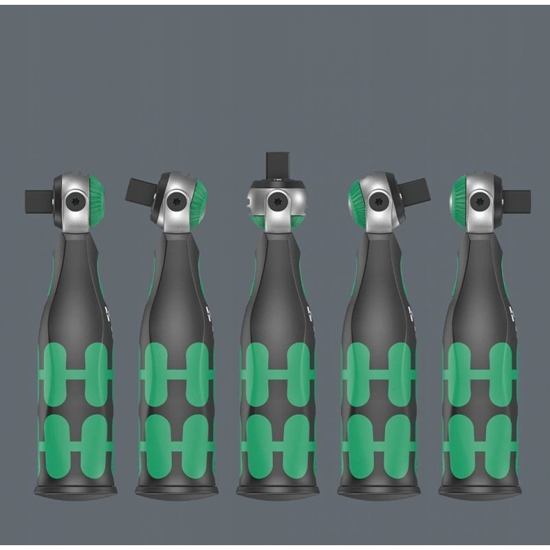Grzechotka posiada wychylną główkę z pięcioma zdefiniowanymi ustawieniami, które można zablokować w dowolnej pozycji. To rozwiązanie sprawia, że praca w wąskich przestrzeniach montażowych staje się znacznie łatwiejsza i bardziej komfortowa.