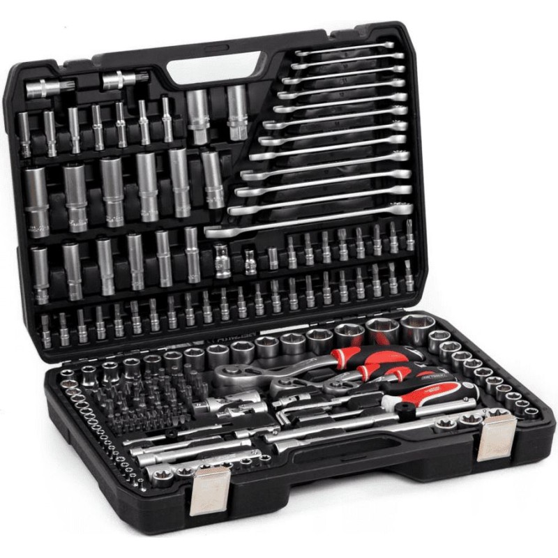 Profesjonalny zestaw kluczy grzechotkowych z napędem 1/4", 3/8" i 1/2". Dwustronny klucz grzechotkowy idealnie nadaje się do dokręcania i odkręcania śrub w trudno dostępnych miejscach. Przycisk szybkiego zwalniania pozwala na szybką wymianę nasadek i bitów. mechanizm zapadkowy grzechotki wyposażony w 72 zęby - skok co 5 stopni. Dźwignia z tyłu głowicy pozwala na szybką i sprawną zmianę kierunku. Miękki, gumowany uchwyt zapewnia wygodne trzymanie. Wszystkie końcówki posiadają oznaczenie rozmiaru dla łatwiejszej identyfikacji. Dzięki uporządkowaniu wszystkich elementów w skrzynce narzędziowej, zestaw ten jest łatwy do przenoszenia.