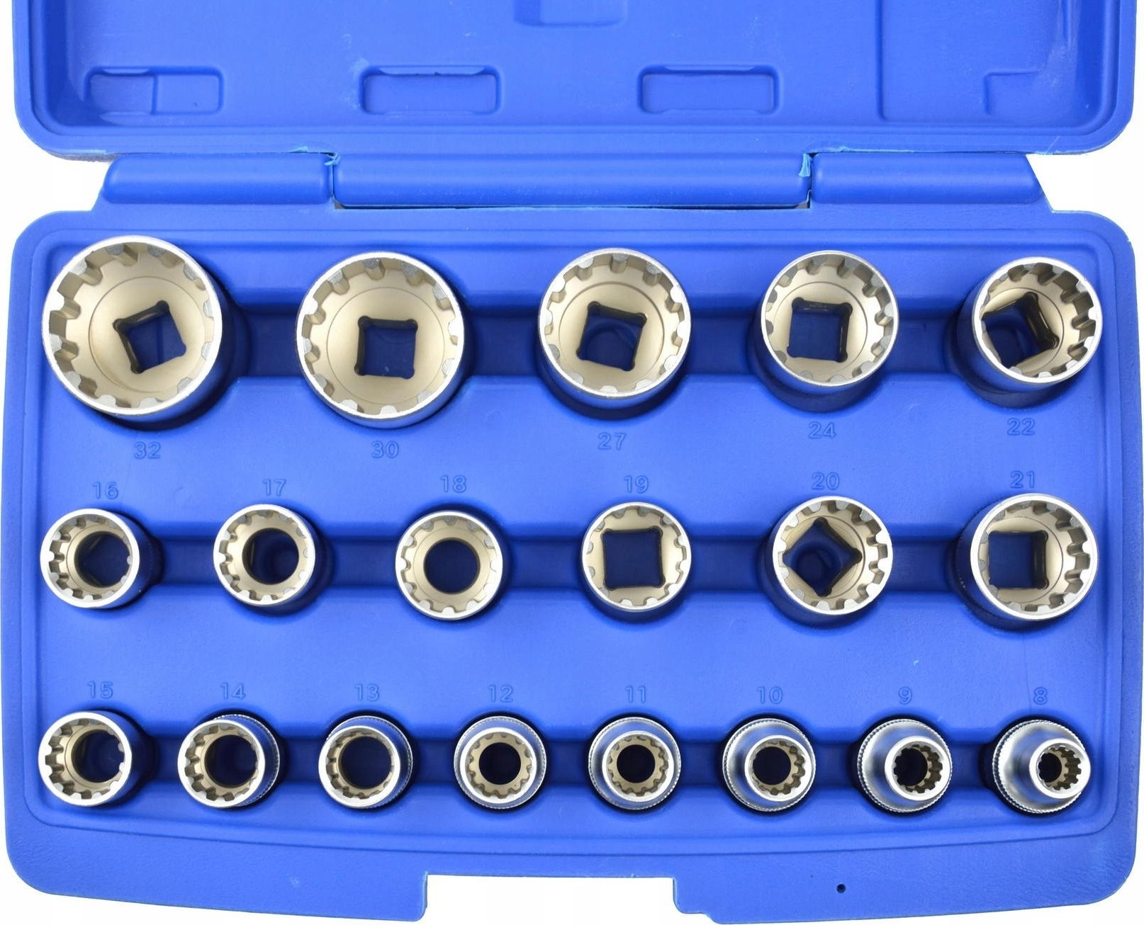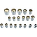 - nasadki 12-kątne: 8, 9, 10, 11, 12, 13, 14, 15, 16, 17, 18, 19, 20, 21, 22, 24, 27, 30, 32 mm