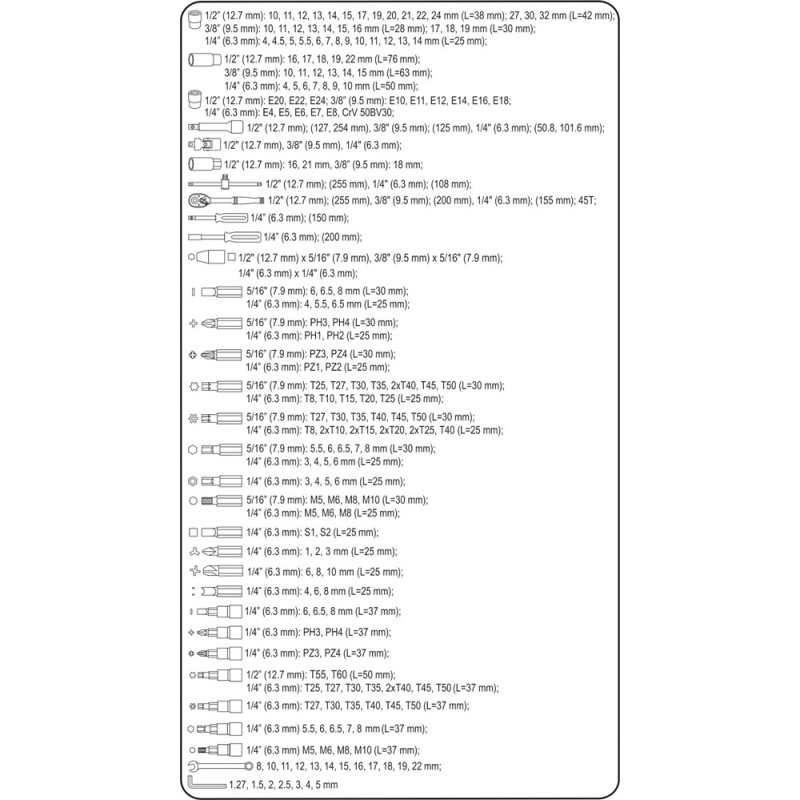 - Narzędzia zostały precyzyjnie wykonane z materiałów zapewniającym im niezawodność. W zestawie znajdziemy pełen zakres nasadek długich i krótkich 1/4" , 3/8" oraz 1/2", przedłużek, przegubów Cardana i wiele innych elementów włącznie z grzechotkami o 45 zębach.