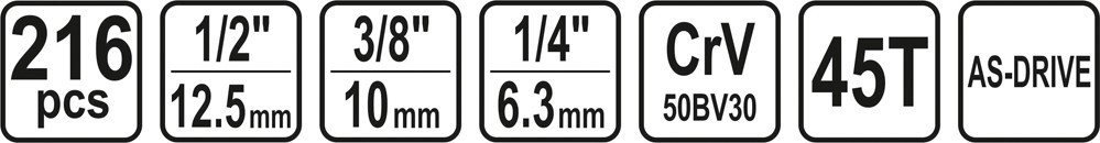 Zestaw narzędziowy 3/8-1/2" 10-32mm 216 części (58691)