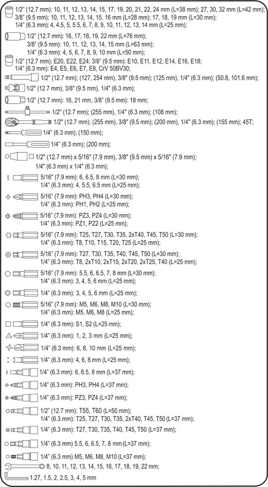 - Nasadki 1/4": 4; 4.5; 5; 5.5; 6; 7; 8; 9; 10; 11; 12; 13; 14 mm,