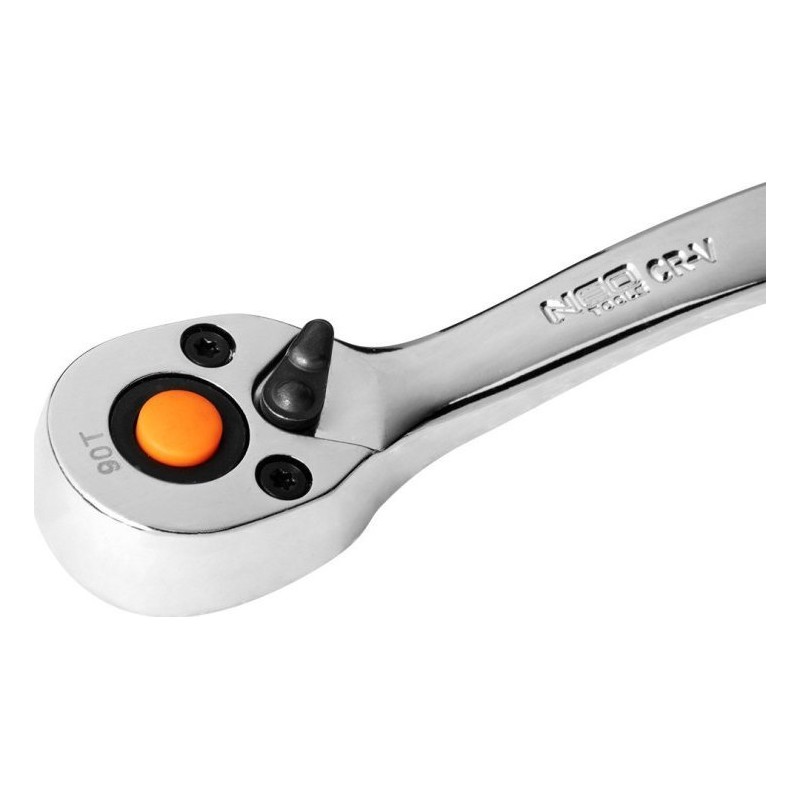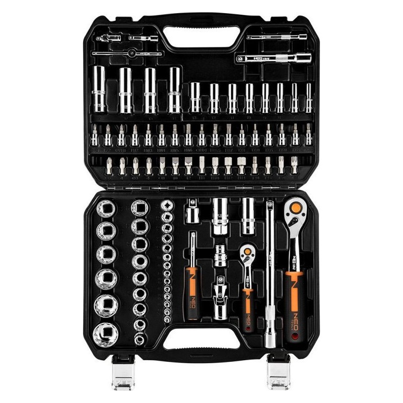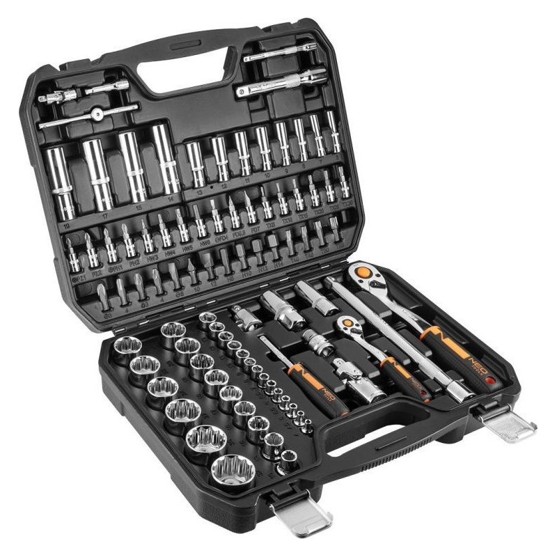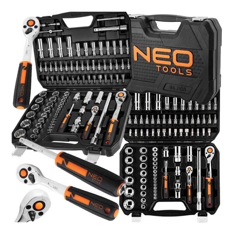 Wykonanych z wysokiej jakości stali chromowo-wanadowej. W skład zestawu wchodzą odgięte grzechotki 1/2" i 1/4" (trwały mechanizm zapadkowy - 90 zęby). Zestaw zawiera bogaty pakiet nasadek(w rozmiarach od 4 do 32 mm) i końcówek wkrętakowych (płaskie, krzyżowe, sześciokątne, Torx). Uzupełnieniem jest szeroki pakiet akcesoriów. Całość dostarczona jest w solidnej i praktycznej walizce wykonanej z tworzywa sztucznego. Marka NEO spełnia oczekiwania profesjonalistów.
