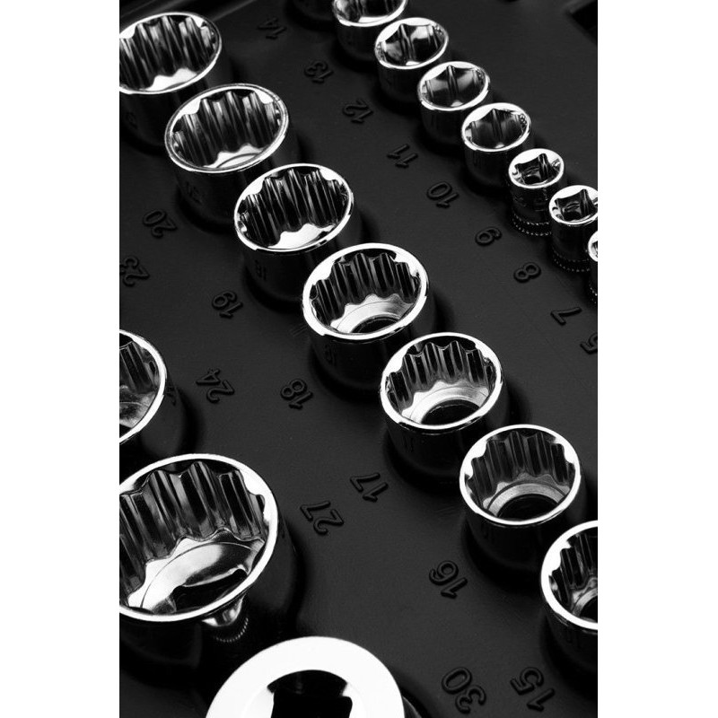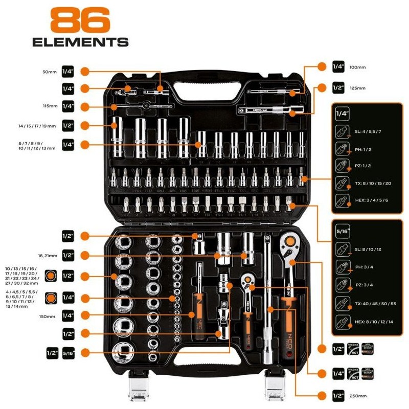 Zestaw kluczy nasadowych 1/2" i 1/4" NEO (nr ref. 10-060) składa się z 86 elementów
