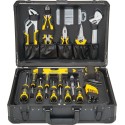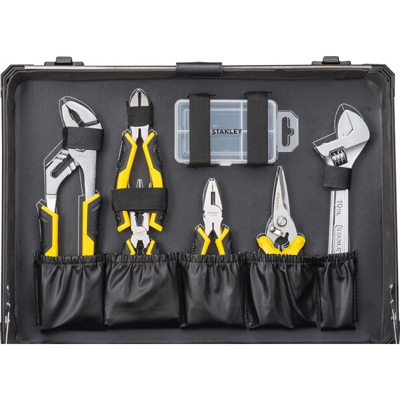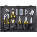 - Górna pokrywa - szczypce nastawne 250 mm, obcinarki boczne 160 mm, szczypce półokrągłe 160 mm, szczypce uniwersalne 160 mm, nożyce uniwersalne 182 mm, klucz nastawny 250 mm, kasetka 112 x 68 x 29 mm (6 przegródek 35 x 32 mm)