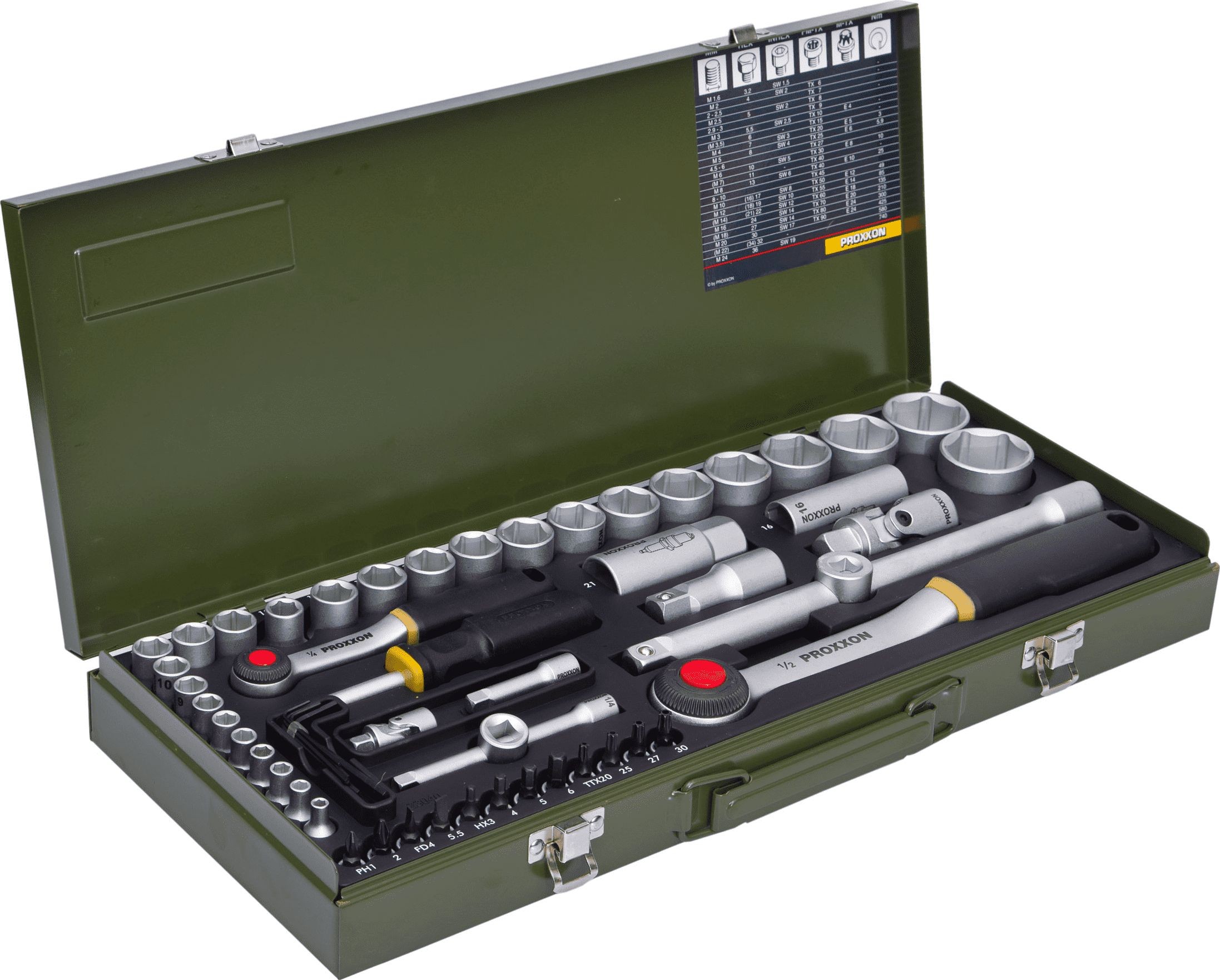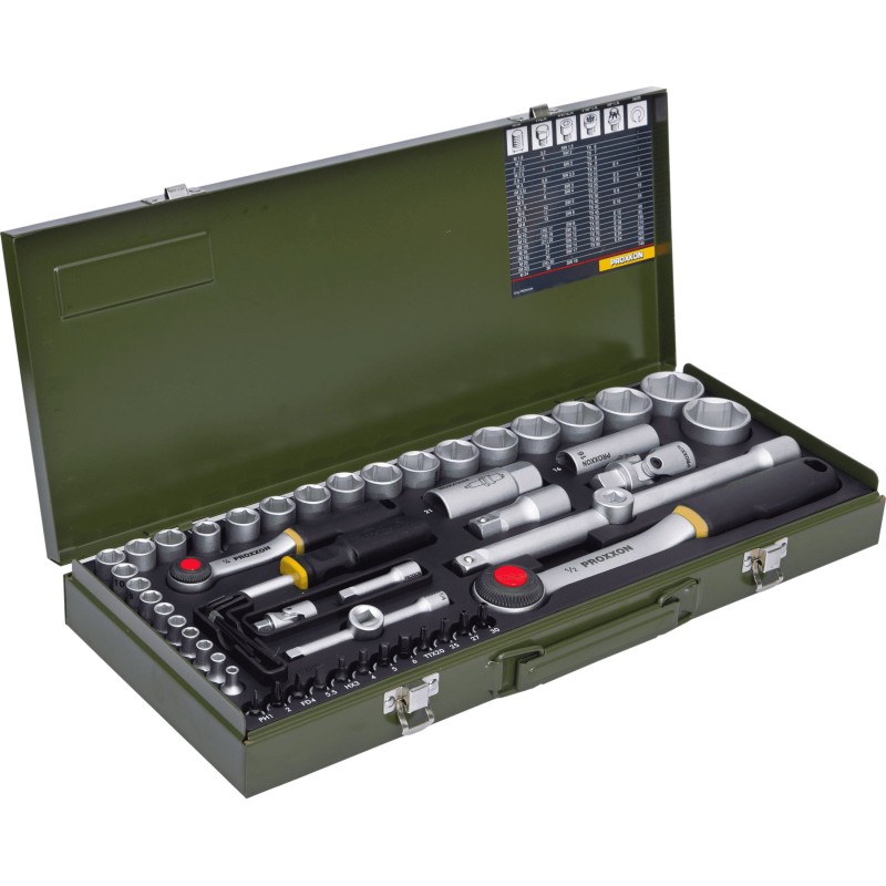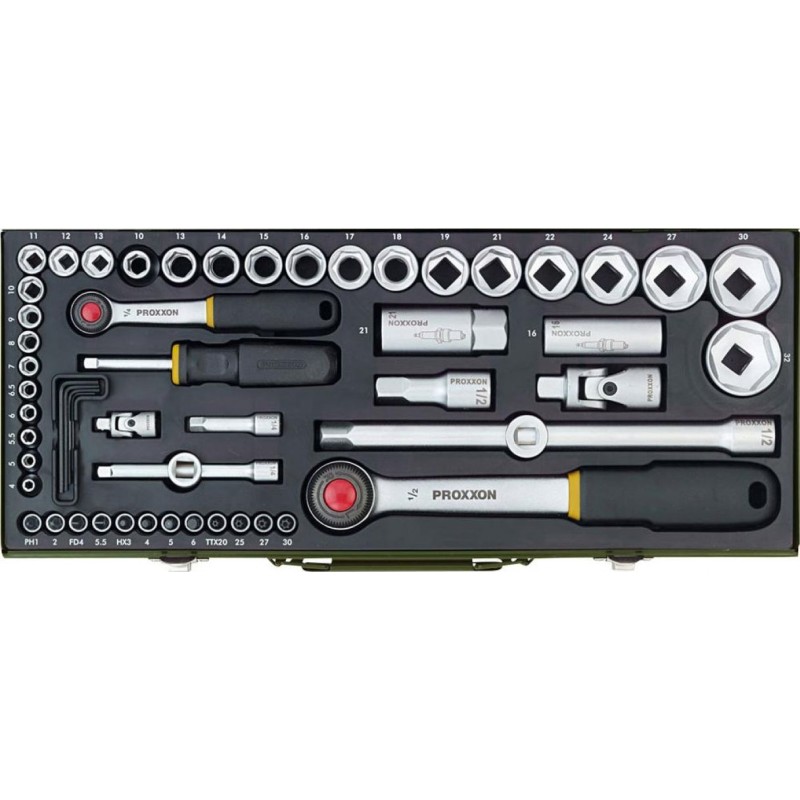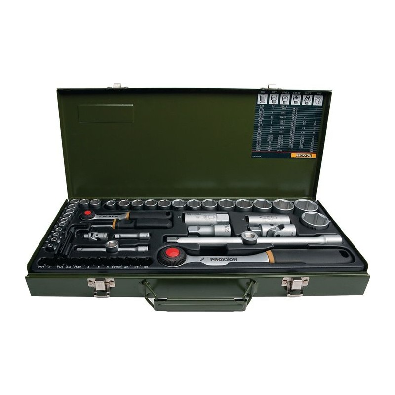 Ogromną zaletą prezentowanego zestawu jest jego cena – za stosunkowo niską kwotę otrzymujesz wysokiej klasy ekwipunek sprawdzający się doskonale jako wyposażenie domowego garażu albo profesjonalnego warsztatu. Opinie konsumentów potwierdzają, że sprzęt PROXXON spełnia oczekiwania i wypada dobrze na tle konkurencji. Producent sam zapewnia długą gwarancję, a więc wie, że udostępnia klientom świetne narzędzia. Postaw na komplet kluczy nasadowych PROXXON z dodatkami, dzięki któremu Twoja praca stanie się jeszcze bardziej efektywna i komfortowa.