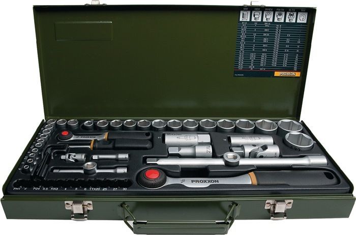W zestawie PROXXON znajdują się nie tylko klucze, ale także wszystkie najważniejsze akcesoria, wspomagające Cię podczas wykonywania poszczególnych czynności serwisowych. Sprawiają one, że całe wyposażenie jest uniwersalne – daje radę w niemal każdej sytuacji, o ile rozmiary nominalne połączeń gwintowych odpowiadają konstrukcji narzędzia. O jakich dodatkach mowa? Producent dostarcza do kompletu między innymi nasadki, wkrętaki do zwykłych śrub, imbusy, bity, czy przedłużki.