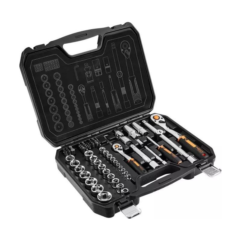 Wielozadaniowy zestaw kluczy nasadowych ½” oraz ¼” wysokiej jakości, zawierający 73 sztuki narzędzi oraz akcesoriów od marki NEO. Produkty oferowane w praktycznej walizce z tworzywa sztucznego, z metalowymi zatrzaskami oraz poręcznym uchwytem. Dodatkowo, wnętrze opakowania zostało wyłożone specjalną wkładką, która umożliwia utrzymanie porządku i zabezpiecza zawartość przed uszkodzeniem.