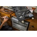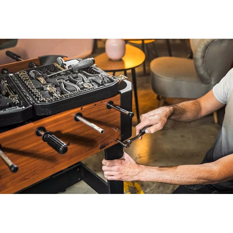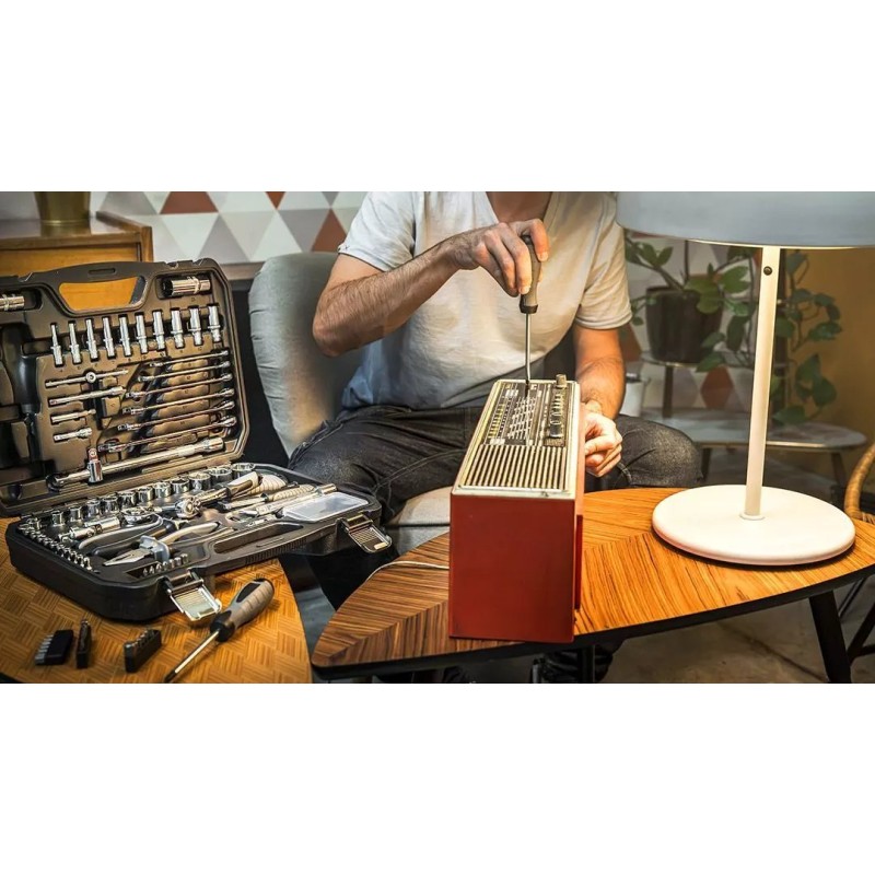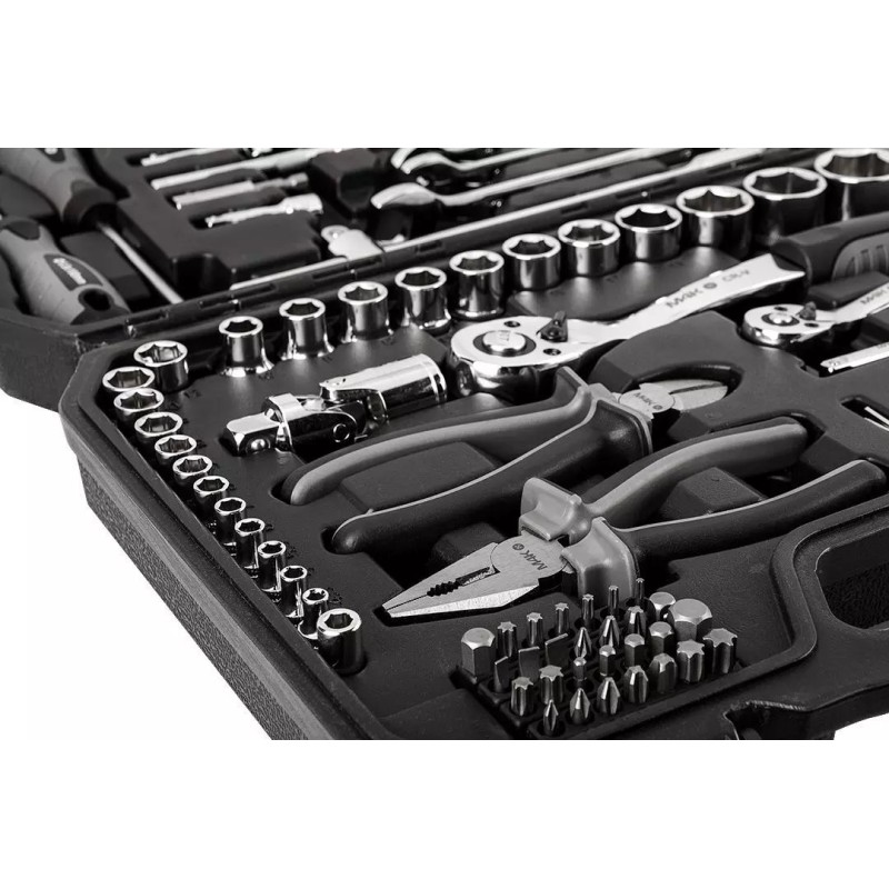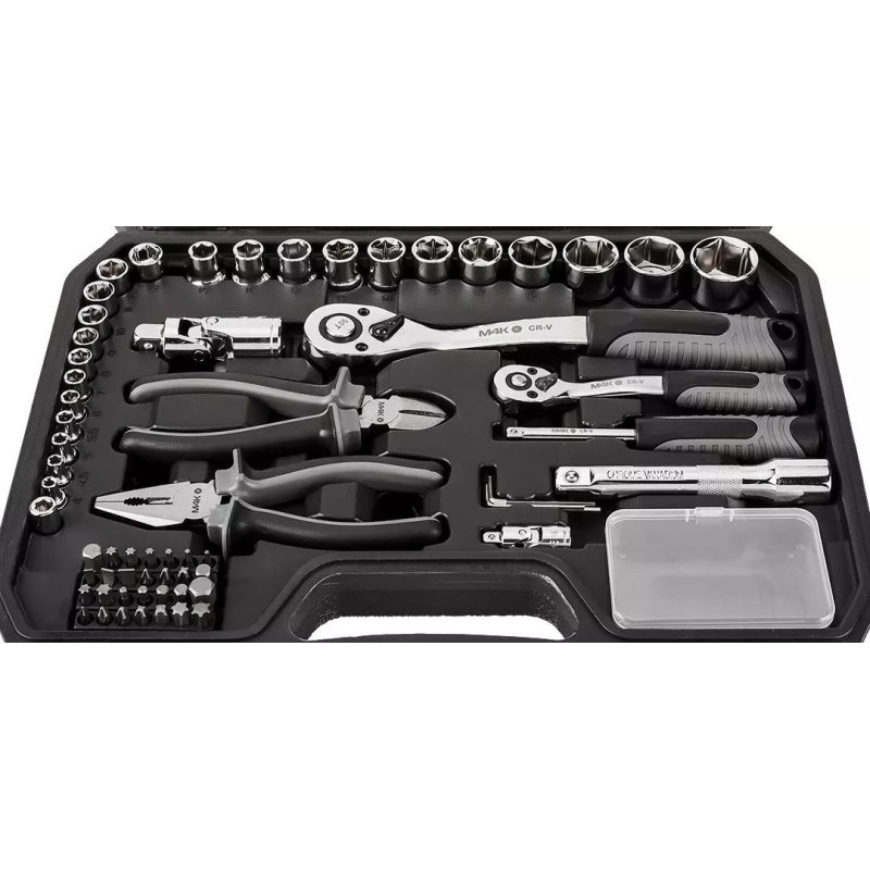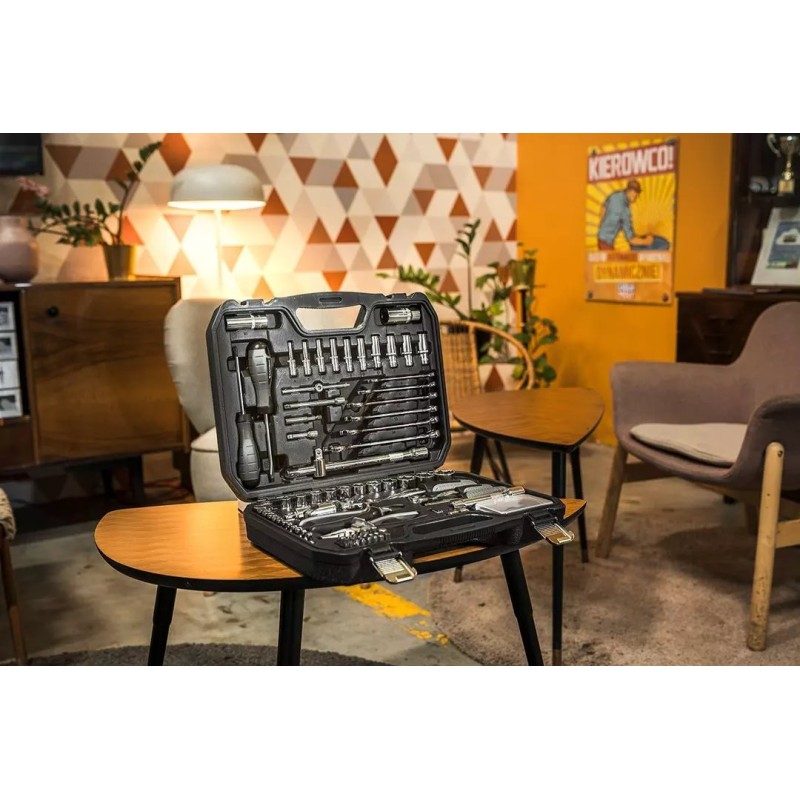 Ten zestaw to prawdziwa gratka dla każdego fana motoryzacji. Znajdziecie w nim: nasadki, grzechotki, klucze płasko-oczkowe, wkrętaki, szczypce, bity, pokrętła, nasadki do świec, przedłużki, przeguby i zestaw kluczy sześciokątnych. Wszystko to pomieściliśmy w poręcznej walizce z charakterystycznym, niepowtarzalnym wytłoczonym wzorem oraz logo M4K, abyście zawsze mieli je pod ręką.