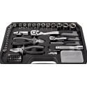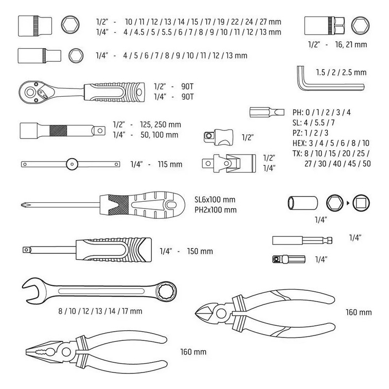 - elementy z mocowaniem ¼” – 12 krótkich nasadek od 4 do 13 mm, 10 nasadek długich od 4 do 13 mm także, grzechotka 90T, pokrętło T, przegub, uchwyt z rękojeścią,