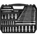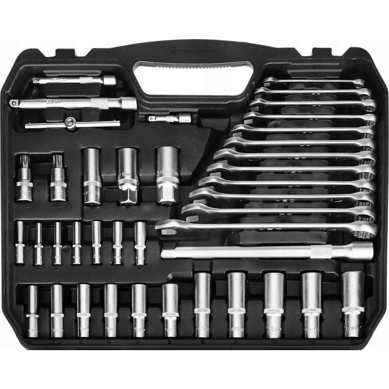Klucze płasko-oczkowe w zestawie obejmują rozmiary od 8 do 22 mm, co umożliwia pracę z wieloma typami śrub i nakrętek. Nasadki sześciokątne dostępne są w rozmiarach od 10 do 27 mm, a długie nasadki od 16 do 22 mm, co pozwala na efektywną pracę nawet z trudno dostępnymi elementami.