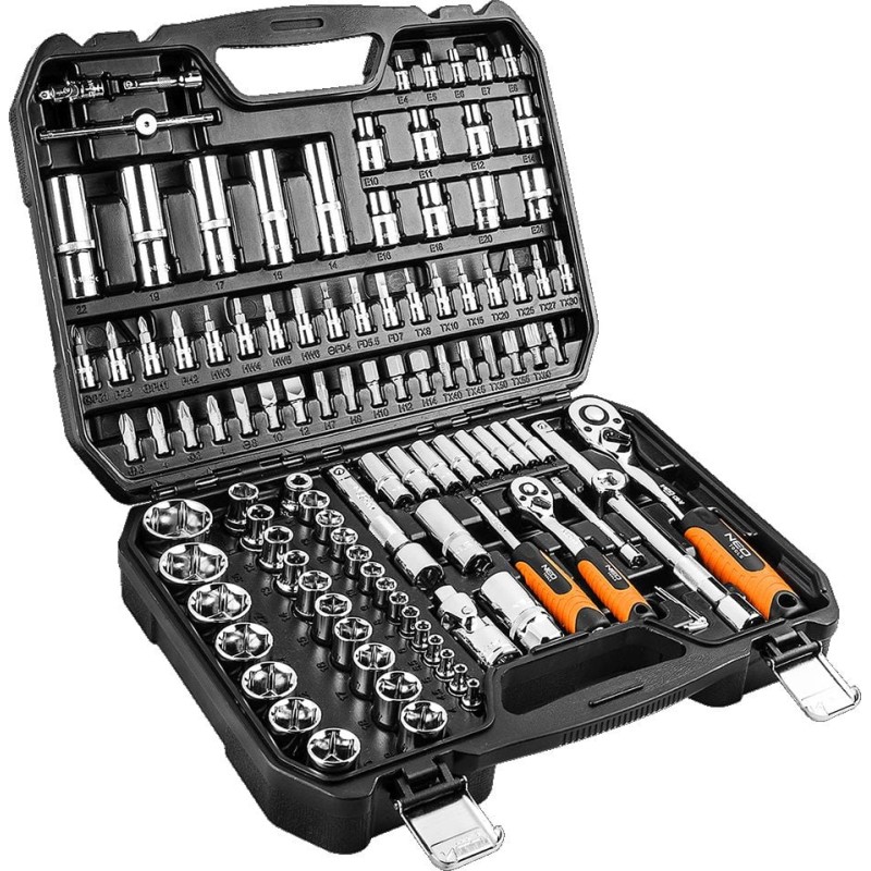 Praktyczny zestaw kluczy nasadowych NEO w poręcznej walizce. Komplet zawiera 110 elementów, a w tym grzechotki 1/2” oraz 1/4” z rękojeściami o ergonomicznym kształcie, a także pakiet nasadek sześciokątnych, nasadki Torx oraz końcówki wkrętakowe i dodatkowe akcesoria. Całość wykonana jest z wysokiej jakości stali chromowano-wanadowej, dzięki czemu narzędzia te są nie tylko przydatne, ale też bardzo solidne.