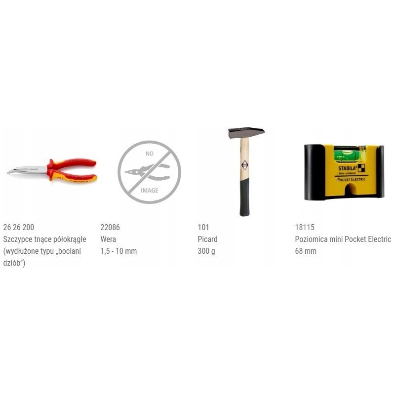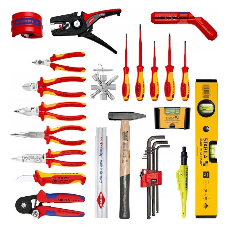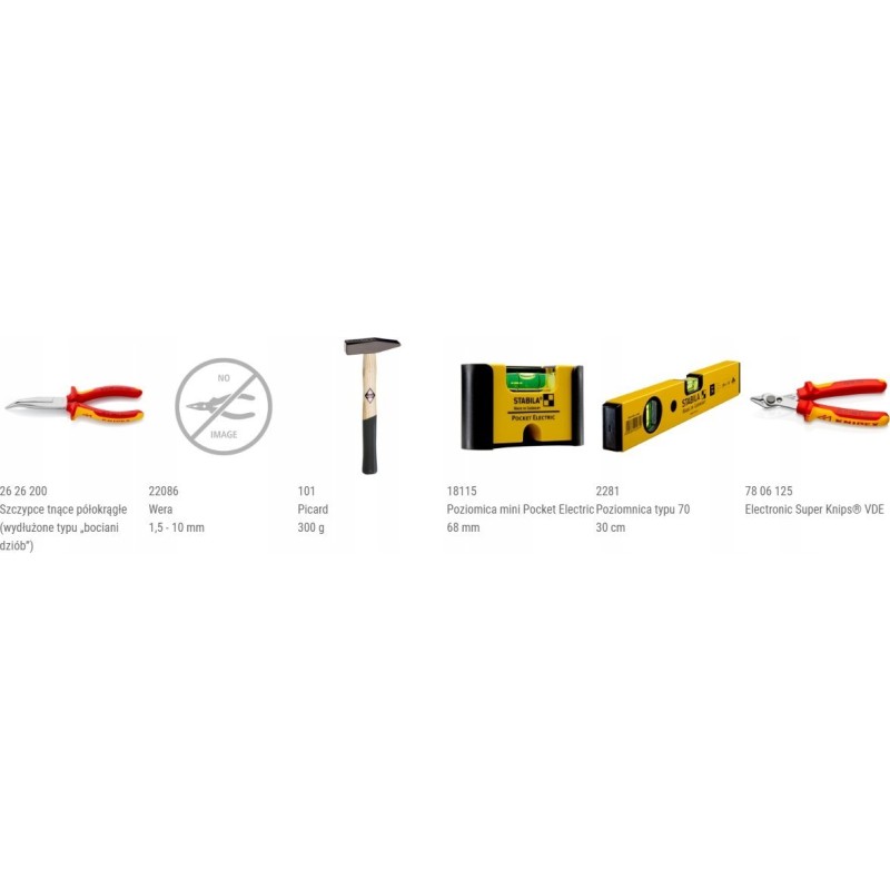 - Wyposażona w 16 narzędzi KNIPEX, w tym 22 narzędzia znanych marek, częściowo przeszło testy VDE zgodnie z normą DIN EN 60900