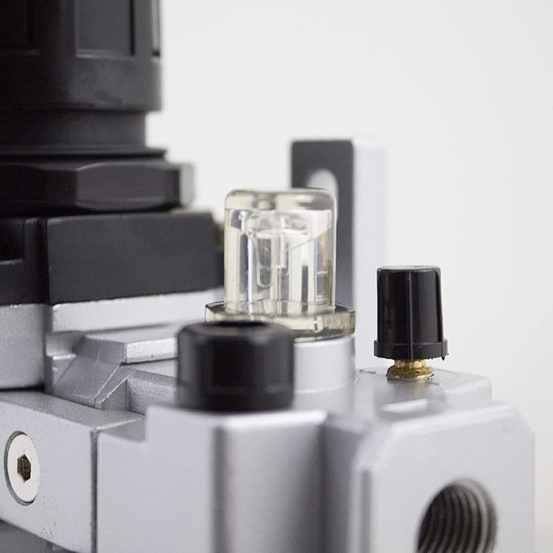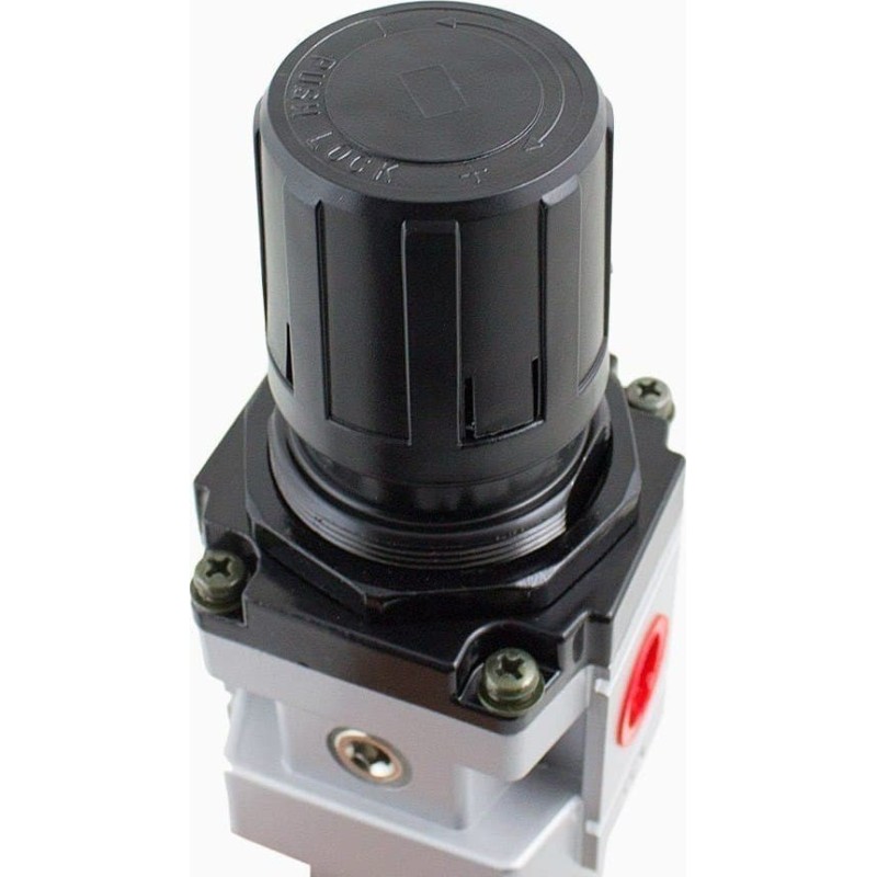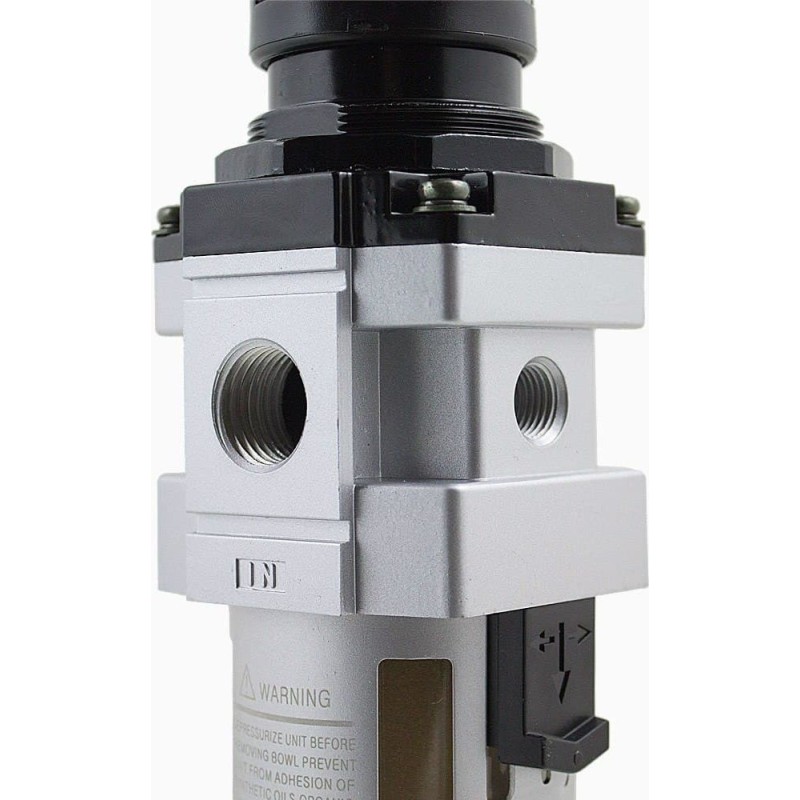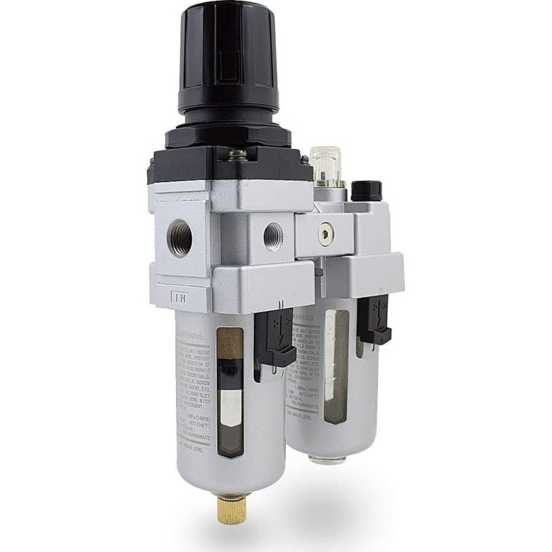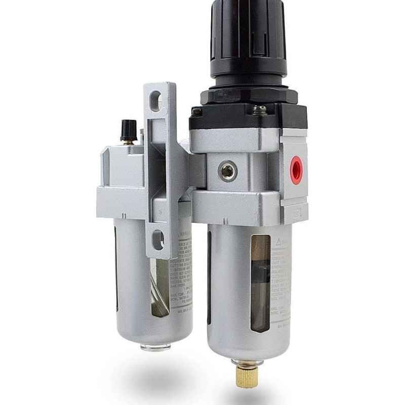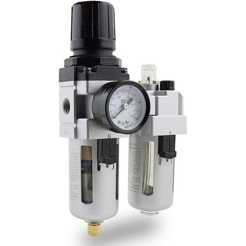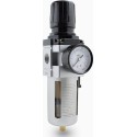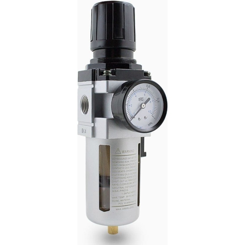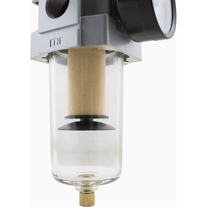 Oferowanym produktem jest filtr powietrza z manometrem i reduktorem z gwintami 1/4" o bardzo trwałej konstrukcji. Posiada odkręcany wieszak do mocowania na ścianie, blokadę regulatora (góra-dół). Jest niezbędnym elementem w instalacjach pneumatycznych 1/4". Wbudowany filtr osusza, jak i separuje olej czy inne zanieczyszczenia. Wodę ze zbiornika opróżniamy pociągając zawór u dołu filtra. Stosując filtr zabezpieczamy urządzenia przed rdzewieniem i uszkodzeniem. Filtr jest również obowiązkowym elementem dla lakierników.